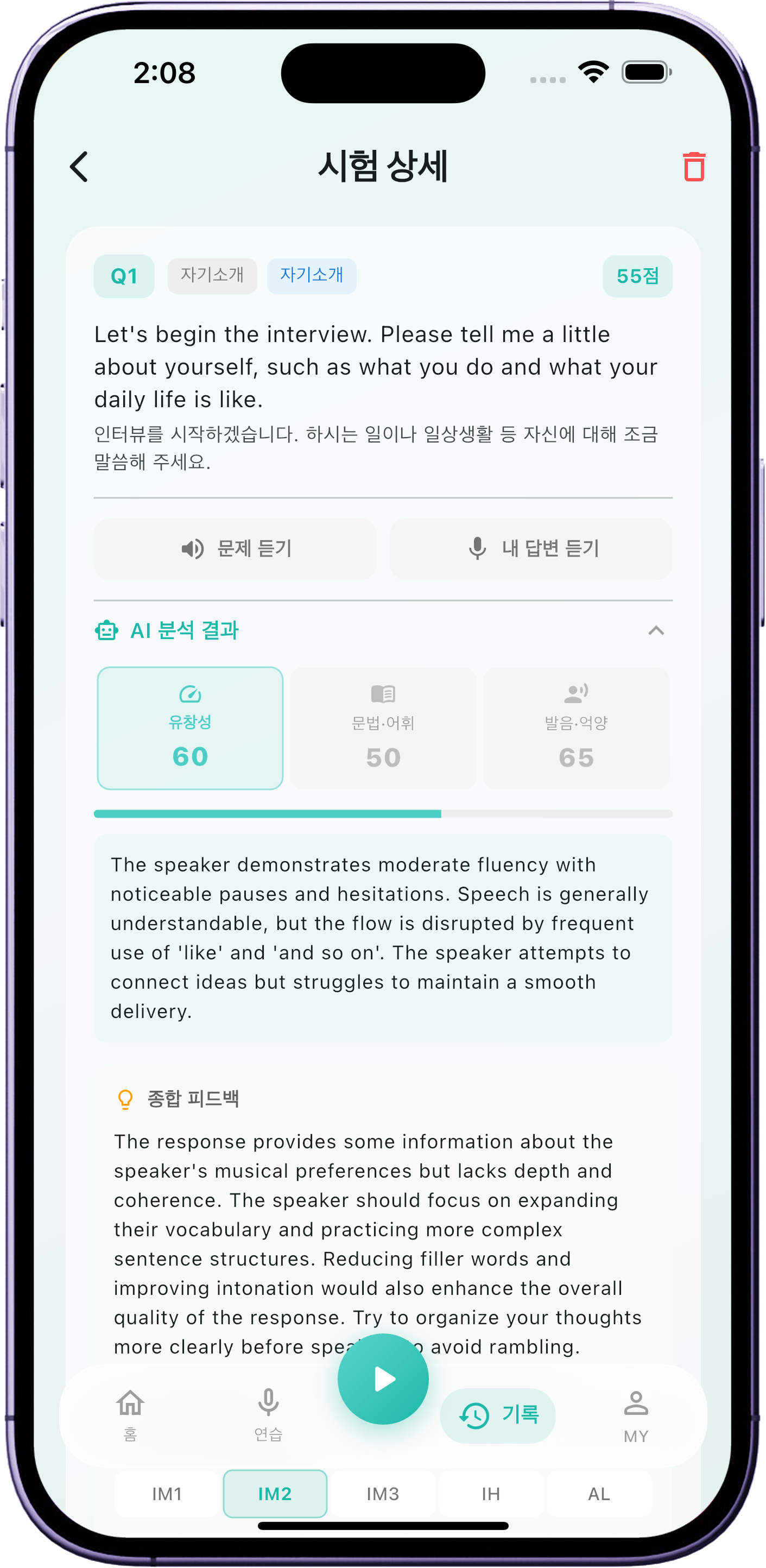 각 문제별로 AI가 답변을 분석하여 개별 점수와 구체적인 피드백을 제공합니다. 등급별 모범 답안과 핵심 표현 추천까지 확인할 수 있습니다.