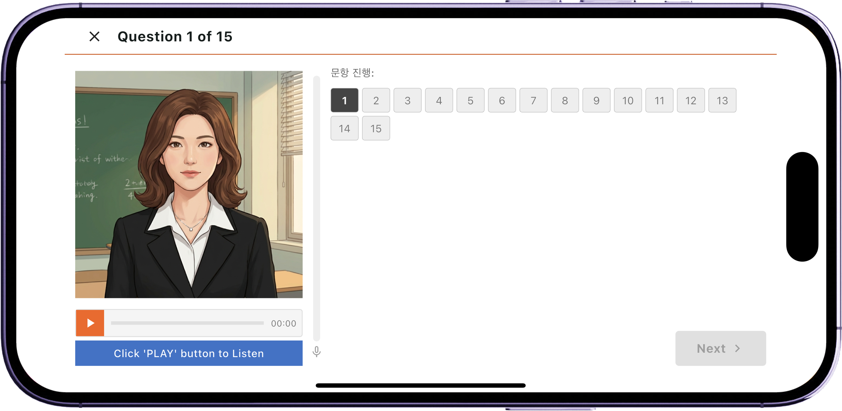 배경 설문부터 모의시험, AI 피드백까지 — 실제 시험과 동일한 흐름으로 완벽하게 대비하세요.