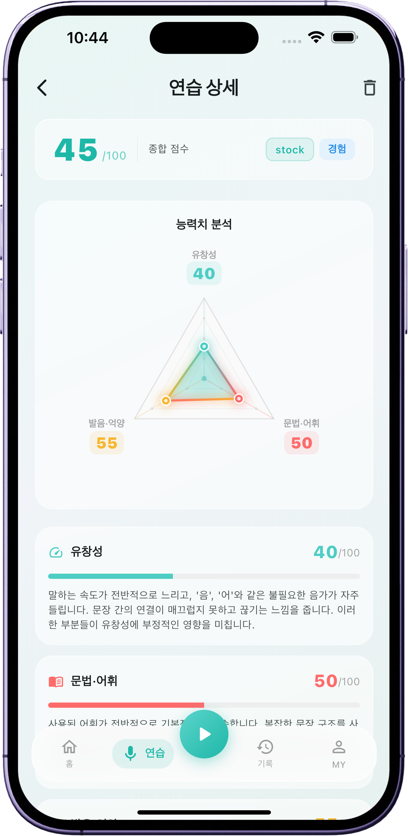 유창성, 문법·어휘, 발음·억양을 영역별로 점수화하고 구체적인 개선 방향을 제시합니다.