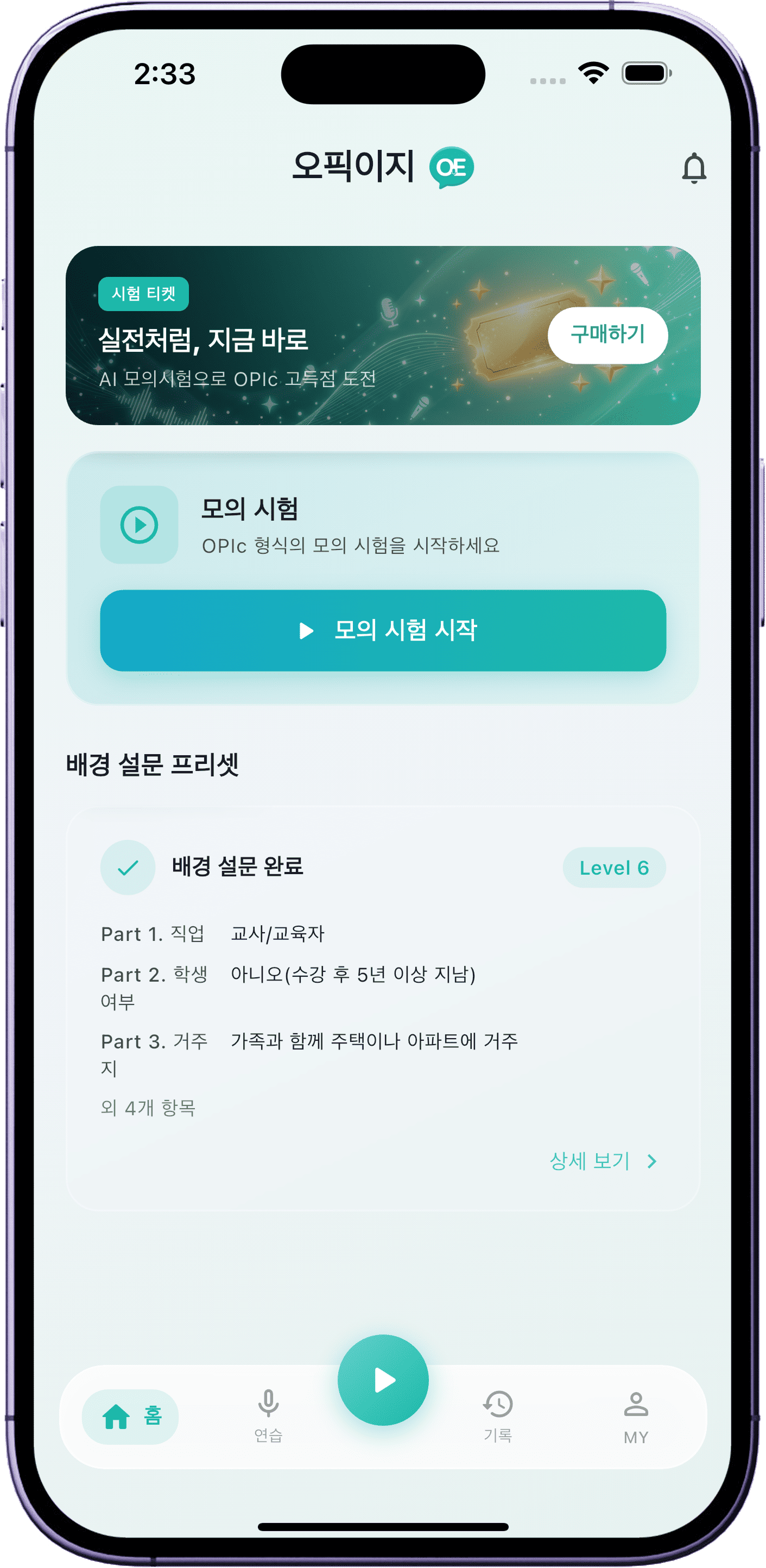 실전과 동일한 환경에서 연습하고, AI가 분석하는 즉각적인 피드백으로 빠르게 성장하세요. 오픽이지와 함께라면 목표 등급 달성이 쉬워집니다.