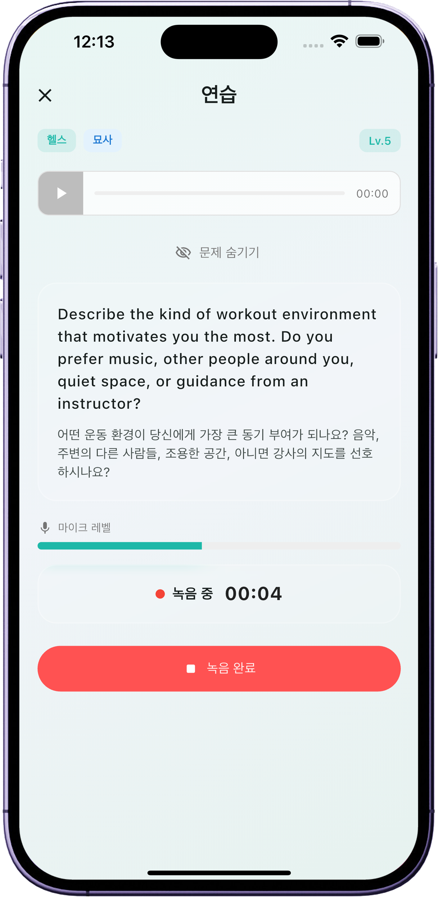 난이도에 따라 12~15문제 전체 세트를 실제 OPIc과 동일한 UI/UX로 체험합니다. 녹음부터 제출까지 완벽한 시뮬레이션.